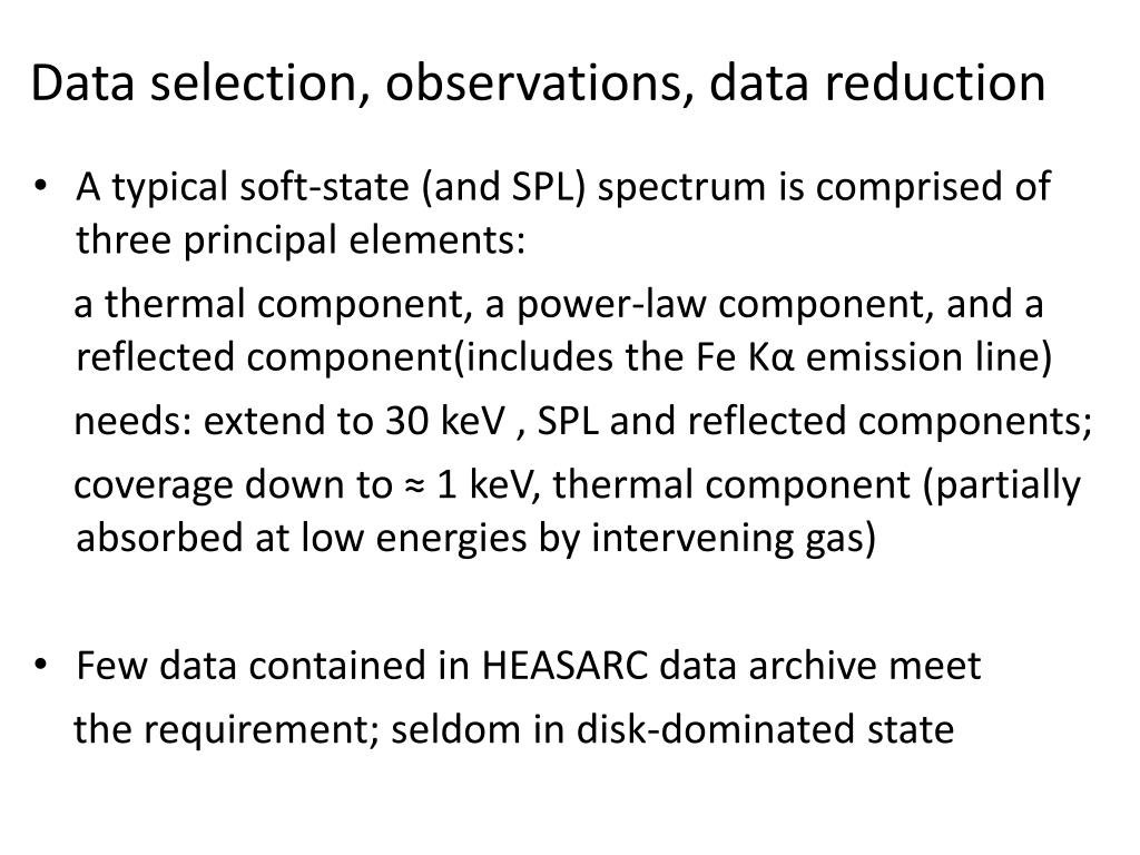 Data selection, observations, data reduction • A typical soft-state (and SPL) spectrum is comprised of three principal elements: a thermal component, a power-law component, and a reflected component(includes the Fe Kα emission line) needs: extend to 30 keV , SPL and reflected components; coverage down to ≈ 1 keV, thermal component (partially absorbed at low energies by intervening gas) • Few data contained in HEASARC data archive meet the requirement; seldom in disk-dominated state