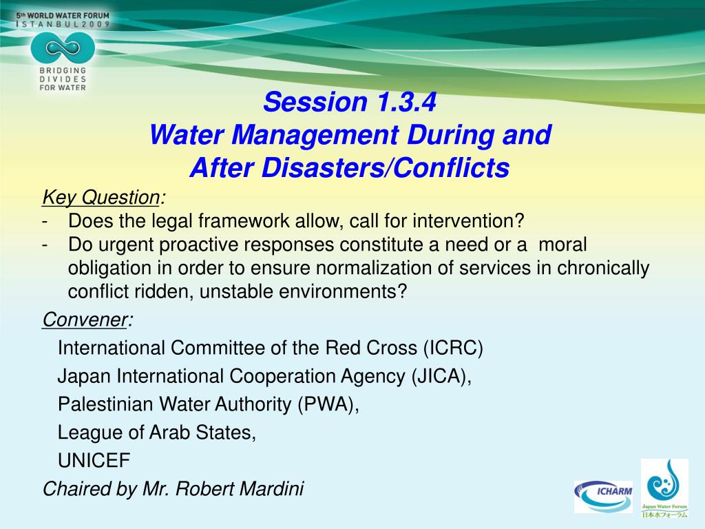 Session 1.3.4 Water Management During and After Disasters/Conflicts • Key Question: • Does the legal framework allow, call for intervention? • Do urgent proactive responses constitute a need or a moral obligation in order to ensure normalization of services in chronically conflict ridden, unstable environments? • Convener: • International Committee of the Red Cross (ICRC) • Japan International Cooperation Agency (JICA), • Palestinian Water Authority (PWA), • League of Arab States, • UNICEF • Chaired by Mr. Robert Mardini