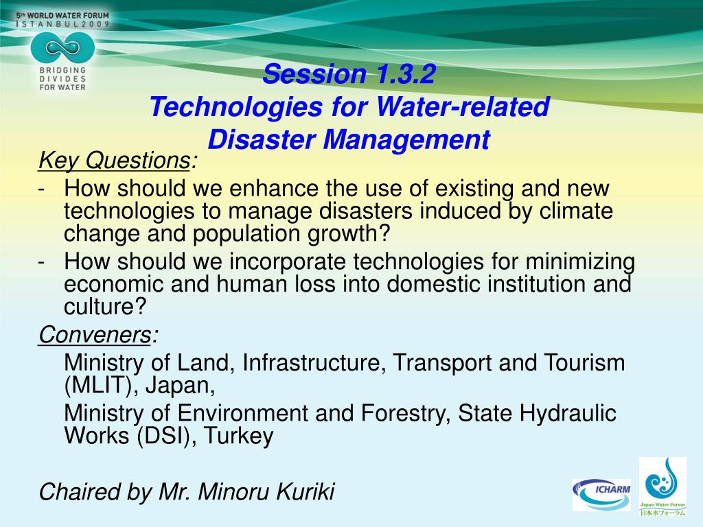 Session 1.3.2 Technologies for Water-related Disaster Management • Key Questions: • How should we enhance the use of existing and new technologies to manage disasters induced by climate change and population growth? • How should we incorporate technologies for minimizing economic and human loss into domestic institution and culture? • Conveners: • Ministry of Land, Infrastructure, Transport and Tourism (MLIT), Japan, • Ministry of Environment and Forestry, State Hydraulic Works (DSI), Turkey • Chaired by Mr. Minoru Kuriki