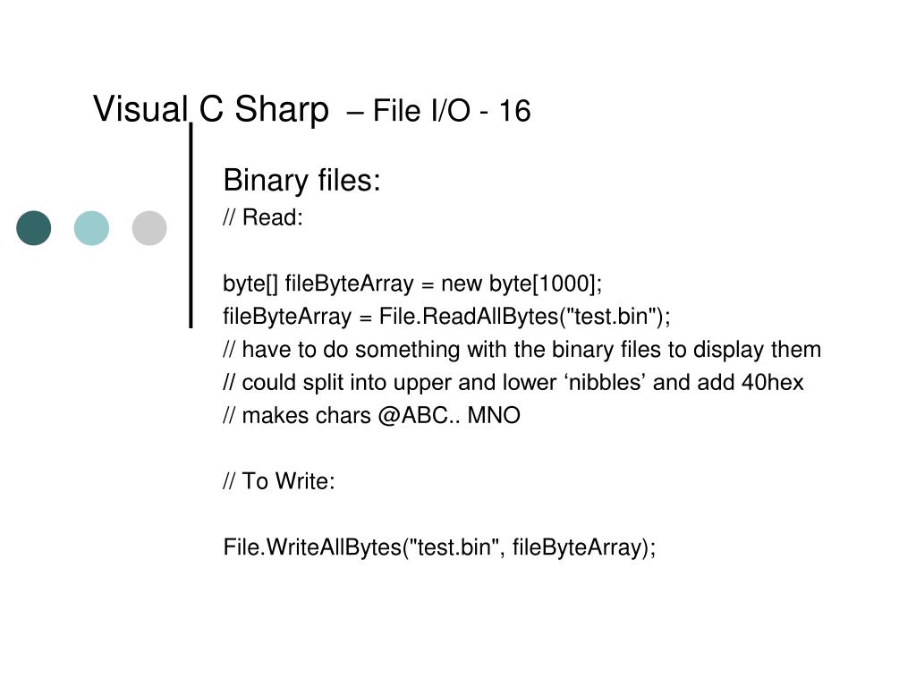 Visual C Sharp– File I/O - 16 Binary files: // Read: byte[] fileByteArray = new byte[1000]; fileByteArray = File.ReadAllBytes("test.bin"); // have to do something with the binary files to display them // could split into upper and lower ‘nibbles’ and add 40hex // makes chars @ABC.. MNO // To Write: File.WriteAllBytes("test.bin", fileByteArray);