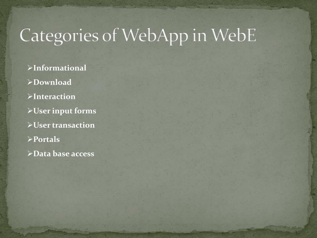 Categories of WebApp in WebE • Informational • Download • Interaction • User input forms • User transaction • Portals • Data base access
