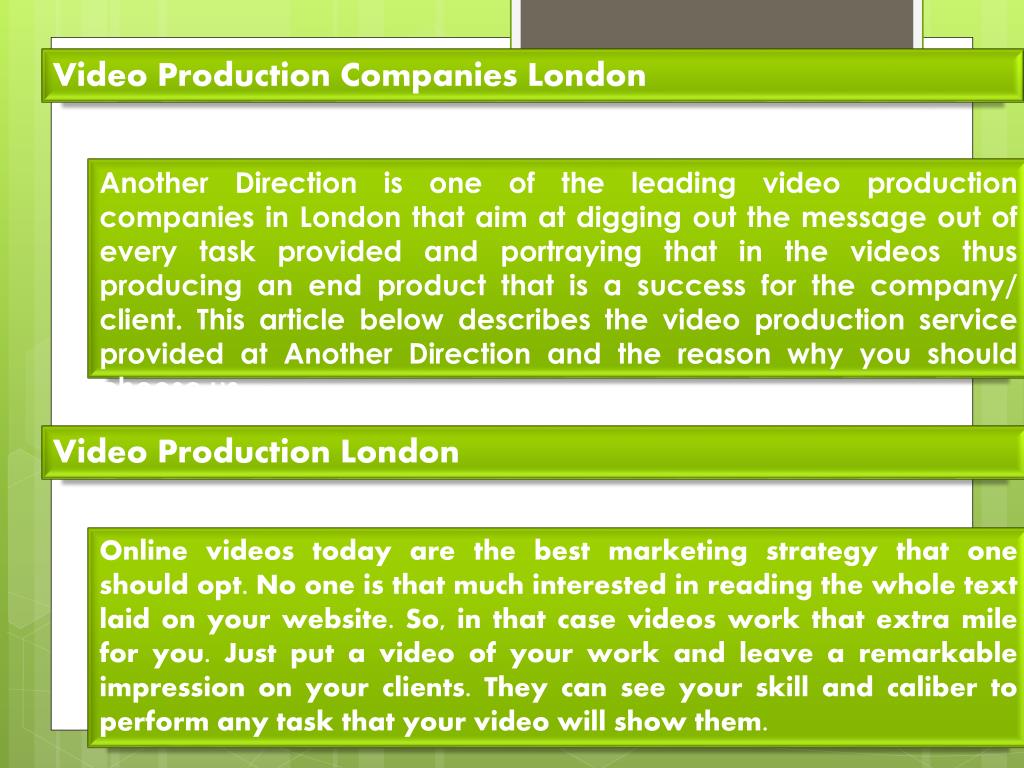Video Production Companies London Another Direction is one of the leading video production companies in London that aim at digging out the message out of every task provided and portraying that in the videos thus producing an end product that is a success for the company/ client. This article below describes the video production service provided at Another Direction and the reason why you should choose us. Video Production London Online videos today are the best marketing strategy that one should opt. No one is that much interested in reading the whole text laid on your website. So, in that case videos work that extra mile for you. Just put a video of your work and leave a remarkable impression on your clients. They can see your skill and caliber to perform any task that your video will show them.