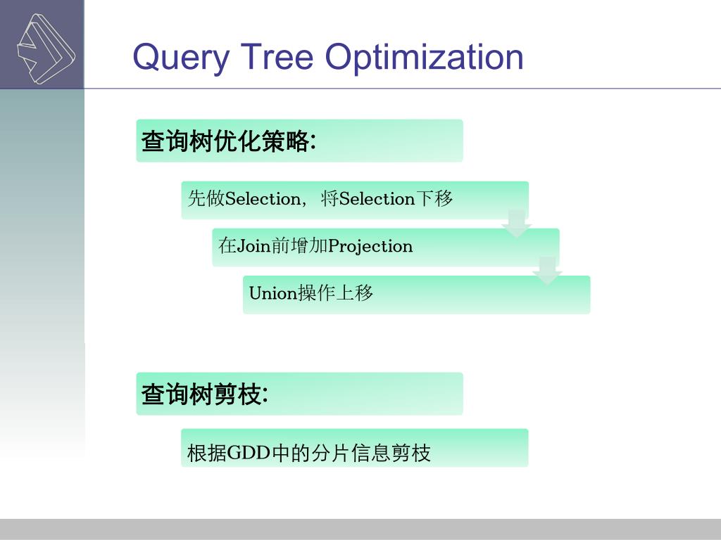 查询树优化策略: • 查询树剪枝: • 根据GDD中的分片信息剪枝 Query Tree Optimization