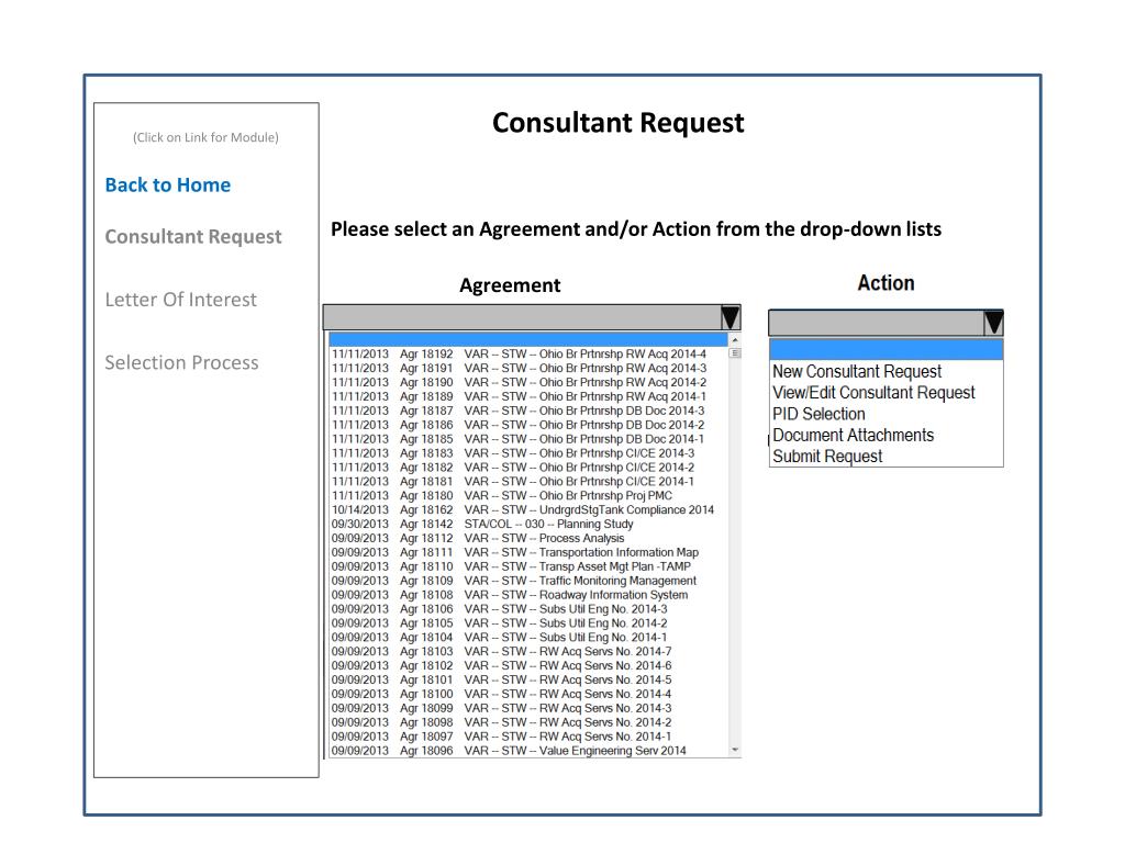 (Click on Link for Module) Back to Home Consultant Request Letter Of Interest Selection Process. Please select an Agreement and/or Action from the drop-down lists . Consultant Request. Agreement. Typically from Ellis. (Click on Link for Module) Back to Home Consultant Request