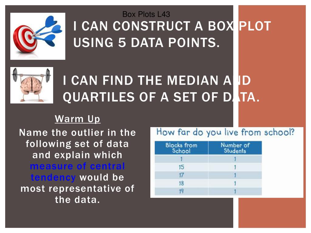 Box Plots L43 I can find the median and quartiles of a set of data. I can construct a box plot using 5 data points. Warm Up Name the outlier in the following set of data and explain which measure of central tendency would be most representative of the data.