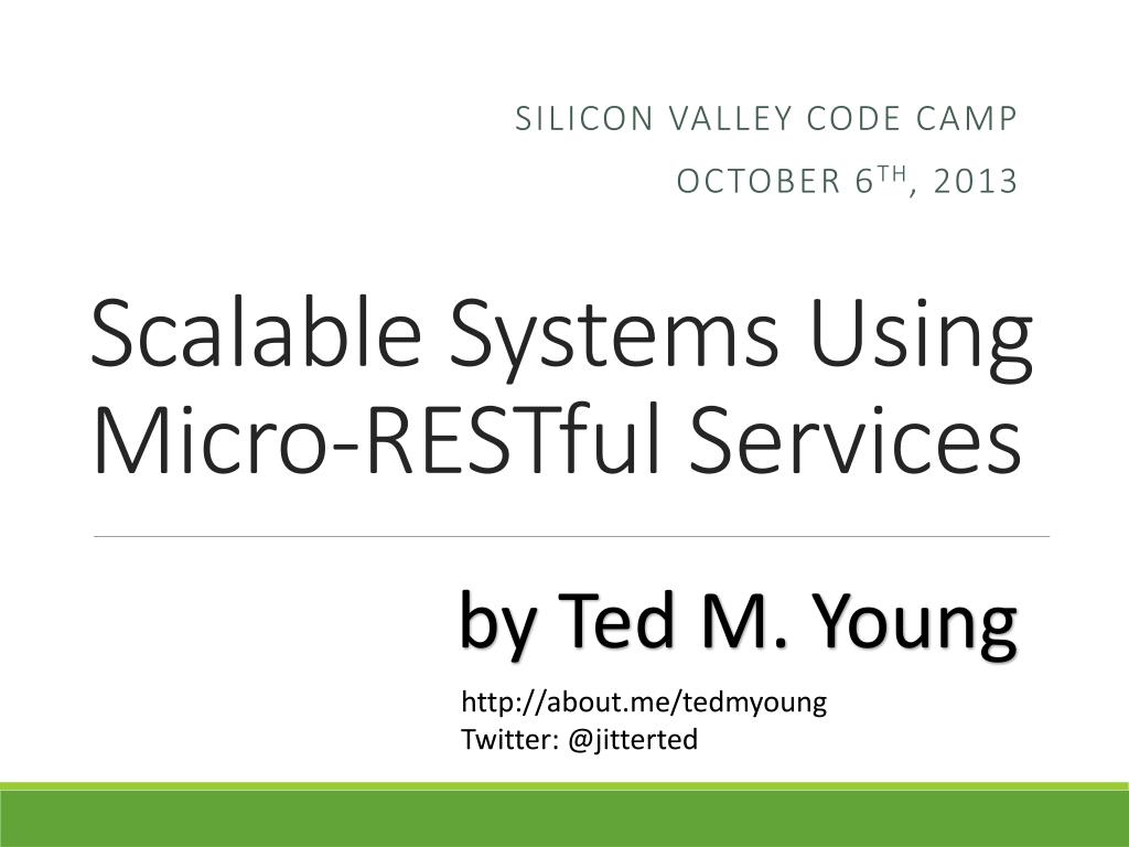 Scalable Systems Using Micro- RESTful Services. silicon valley code camp October 6 th , 2013. by Ted M. Young. http://about.me/tedmyoung Twitter: @ jitterted. What to expect this session. The Problem An Architectural Solution Our Proof of Concept. The Problems. Monolithic.