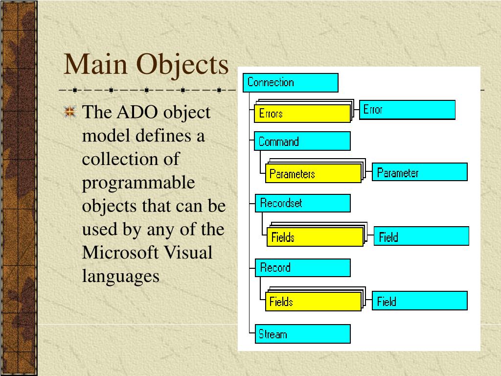 Main Objects • The ADO object model defines a collection of programmable objects that can be used by any of the Microsoft Visual languages