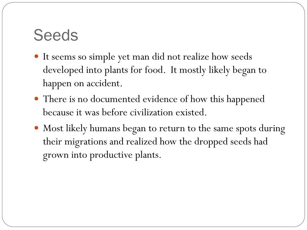 Seeds • It seems so simple yet man did not realize how seeds developed into plants for food. It mostly likely began to happen on accident. • There is no documented evidence of how this happened because it was before civilization existed. • Most likely humans began to return to the same spots during their migrations and realized how the dropped seeds had grown into productive plants.