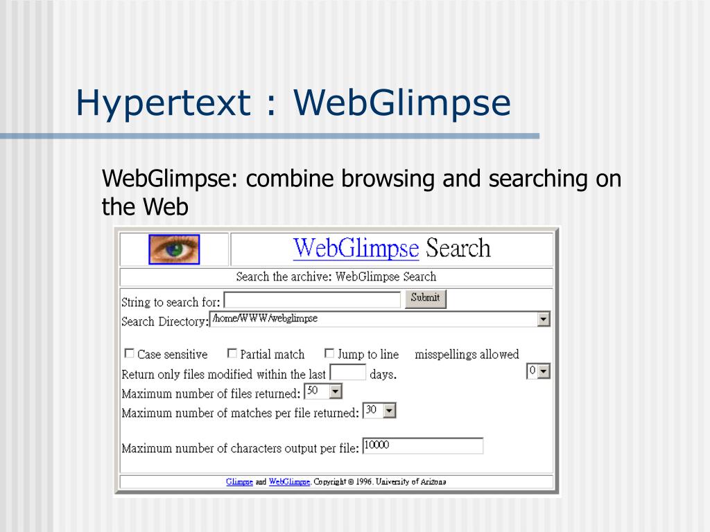 Hypertext : WebGlimpse WebGlimpse: combine browsing and searching on the Web
