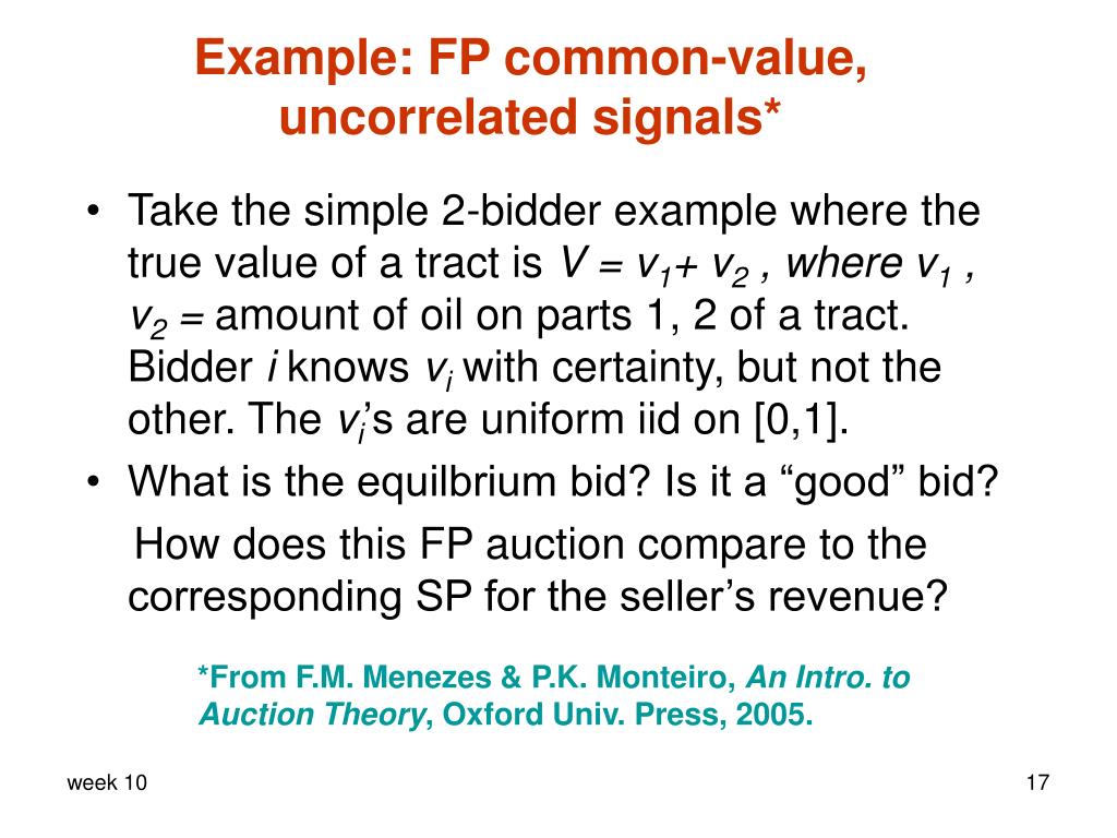 Example: FP common-value, uncorrelated signals* • Take the simple 2-bidder example where the true value of a tract is V = v1+ v2 , where v1 , v2 = amount of oil on parts 1, 2 of a tract. Bidder i knows vi with certainty, but not the other. The vi’sare uniform iid on [0,1]. • What is the equilbrium bid? Is it a “good” bid? How does this FP auction compare to the corresponding SP for the seller’s revenue? *From F.M. Menezes & P.K. Monteiro, An Intro. to Auction Theory, Oxford Univ. Press, 2005.