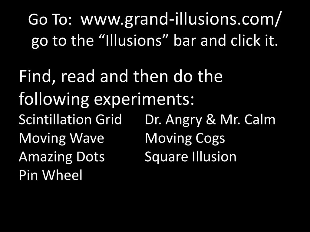 Go To: www.grand-illusions.com/go to the “Illusions” bar and click it. Find, read and then do the following experiments: Scintillation Grid Dr. Angry&Mr. Calm Moving Wave Moving Cogs Amazing Dots Square Illusion Pin Wheel