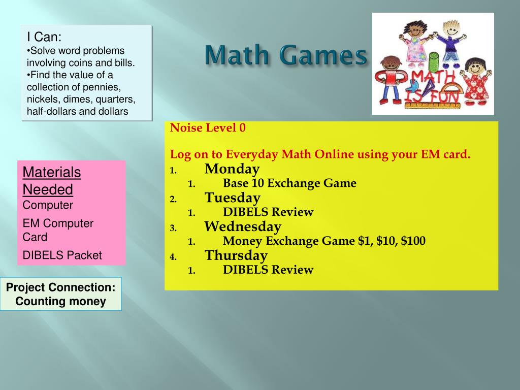 Math Games • I Can: • Solve word problems involving coins and bills. • Find the value of a collection of pennies, nickels, dimes, quarters, half-dollars and dollars Noise Level 0 Log on to Everyday Math Online using your EM card. • Monday • Base 10 Exchange Game • Tuesday • DIBELS Review • Wednesday • Money Exchange Game $1, $10, $100 • Thursday • DIBELS Review Materials Needed Computer EM Computer Card DIBELS Packet Project Connection: Counting money