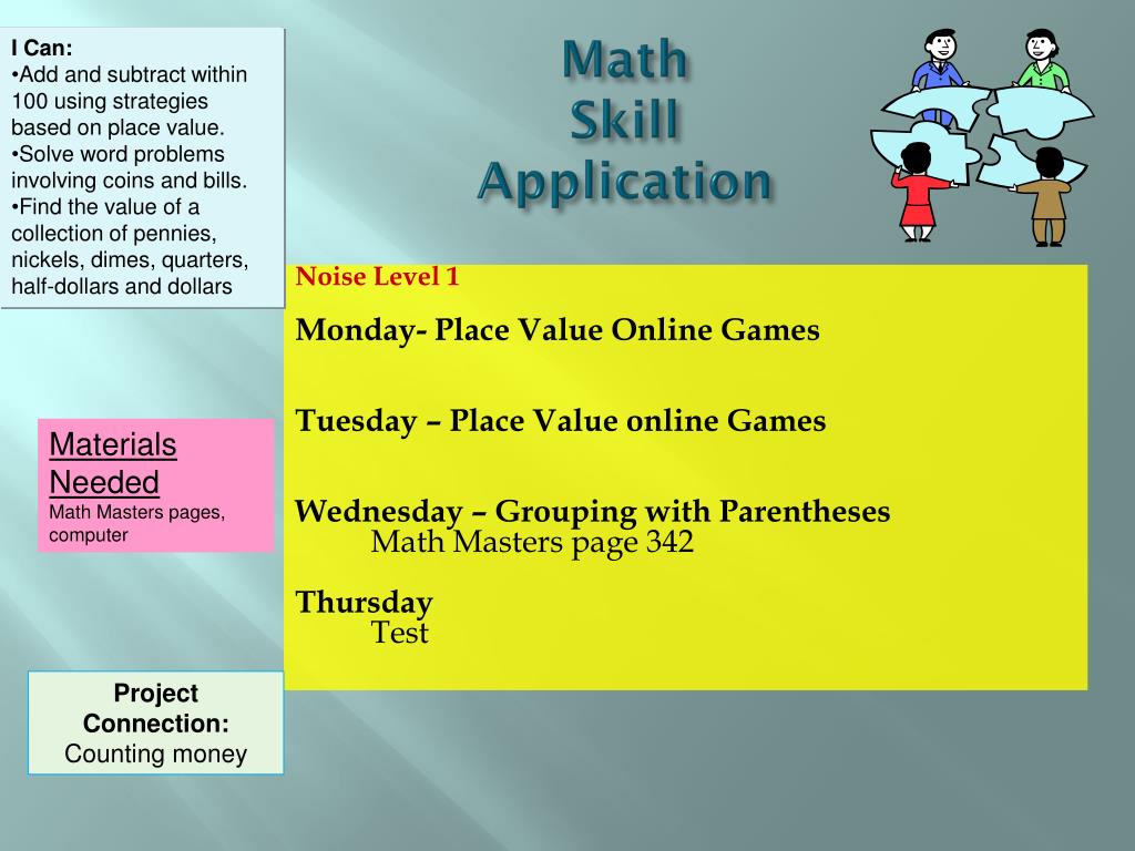 I Can: • Add and subtract within 100 using strategies based on place value. • Solve word problems involving coins and bills. • Find the value of a collection of pennies, nickels, dimes, quarters, half-dollars and dollars MathSkill Application Noise Level 1 Monday- Place Value Online Games Tuesday – Place Value online Games Wednesday – Grouping with Parentheses Math Masters page 342 Thursday Test Materials Needed Math Masters pages, computer Project Connection: Counting money