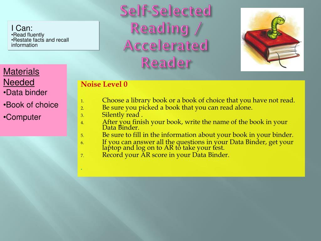 Self-Selected Reading / Accelerated Reader • I Can: • Read fluently • Restate facts and recall information Noise Level 0 • Choose a library book or a book of choice that you have not read. • Be sure you picked a book that you can read alone. • Silently read . • After you finish your book, write the name of the book in your Data Binder. • Be sure to fill in the information about your book in your binder. • If you can answer all the questions in your Data Binder, get your laptop and log on to AR to take your test. • Record your AR score in your Data Binder. . • Materials Needed • Data binder • Book of choice • Computer