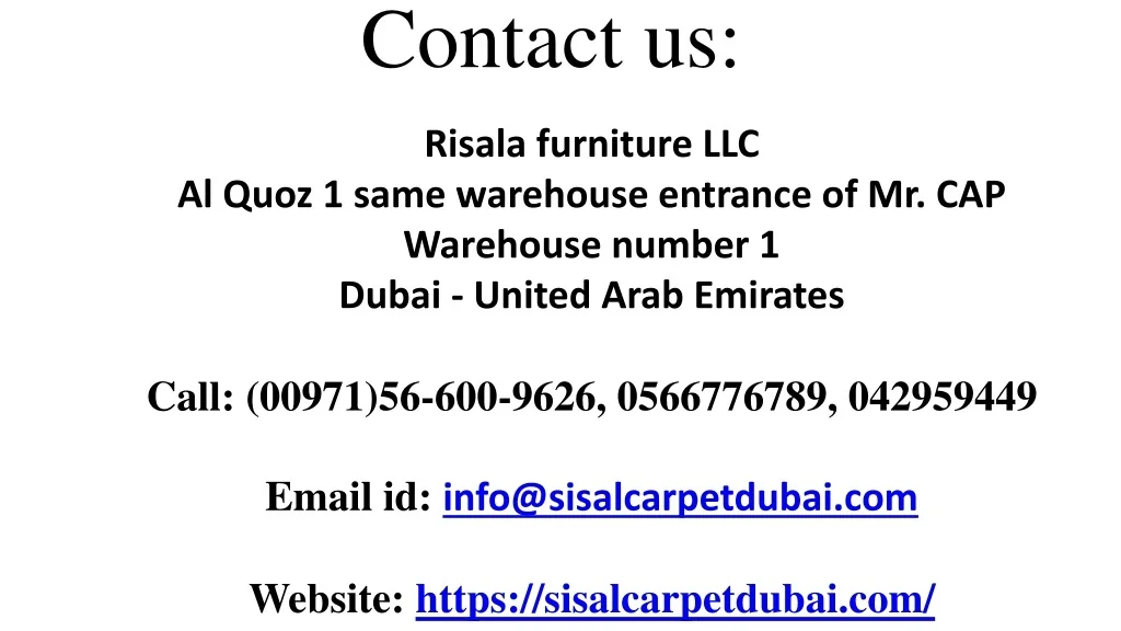 Risala furniture LLCAl Quoz 1 same warehouse entrance of Mr. CAP Warehouse number 1Dubai - United Arab Emirates Call: (00971)56-600-9626, 0566776789, 042959449 Email id: info@sisalcarpetdubai.comWebsite: https://sisalcarpetdubai.com/ Contact us: