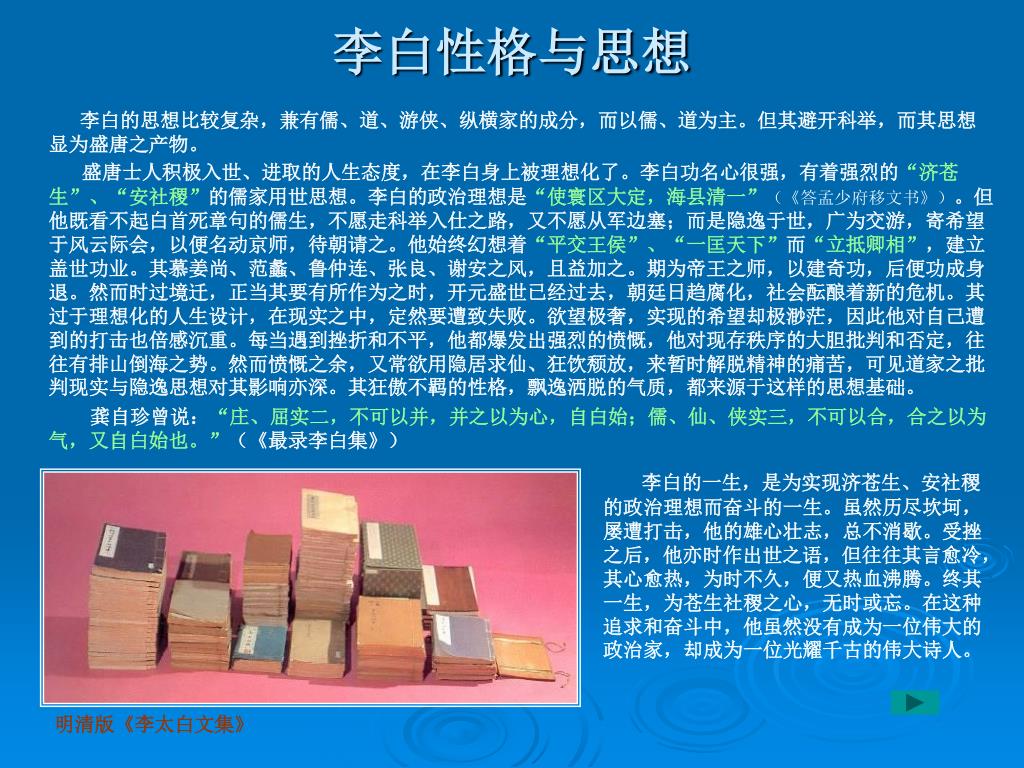 李白性格与思想 李白的思想比较复杂,兼有儒、道、游侠、纵横家的成分,而以儒、道为主。但其避开科举,而其思想显为盛唐之产物。 盛唐士人积极入世、进取的人生态度,在李白身上被理想化了。李白功名心很强,有着强烈的“济苍生”、“安社稷”的儒家用世思想。李白的政治理想是“使寰区大定,海县清一”(《答孟少府移文书》)。但他既看不起白首死章句的儒生,不愿走科举入仕之路,又不愿从军边塞;而是隐逸于世,广为交游,寄希望于风云际会,以便名动京师,待朝请之。他始终幻想着“平交王侯”、“一匡天下”而“立抵卿相”,建立盖世功业。其慕姜尚、范蠡、鲁仲连、张良、谢安之风,且益加之。期为帝王之师,以建奇功,后便功成身退。然而时过境迁,正当其要有所作为之时,开元盛世已经过去,朝廷日趋腐化,社会酝酿着新的危机。其过于理想化的人生设计,在现实之中,定然要遭致失败。欲望极奢,实现的希望却极渺茫,因此他对自己遭到的打击也倍感沉重。每当遇到挫折和不平,他都爆发出强烈的愤慨,他对现存秩序的大胆批判和否定,往往有排山倒海之势。然而愤慨之余,又常欲用隐居求仙、狂饮颓放,来暂时解脱精神的痛苦,可见道家之批判现实与隐逸思想对其影响亦深。其狂傲不羁的性格,飘逸洒脱的气质,都来源于这样的思想基础。 龚自珍曾说:“庄、屈实二,不可以并,并之以为心,自白始;儒、仙、侠实三,不可以合,合之以为气,又自白始也。”(《最录李白集》) 李白的一生,是为实现济苍生、安社稷的政治理想而奋斗的一生。虽然历尽坎坷,屡遭打击,他的雄心壮志,总不消歇。受挫之后,他亦时作出世之语,但往往其言愈冷,其心愈热,为时不久,便又热血沸腾。终其一生,为苍生社稷之心,无时或忘。在这种追求和奋斗中,他虽然没有成为一位伟大的政治家,却成为一位光耀千古的伟大诗人。 明清版《李太白文集》