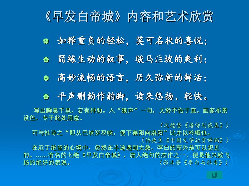 《早发白帝城》内容和艺术欣赏 • 如释重负的轻松,莫可名状的喜悦; • 简练生动的叙事,骏马注坡的爽利; • 高妙流畅的语言,历久弥新的鲜活; • 平声删韵作韵脚,读来悠扬、轻快。 写出瞬息千里,若有神助。入“猿声”一句,文势不伤于直。画家布景设色,专于此处用意。 (沈德潜《唐诗别裁集》) 可与杜诗之“即从巴峡穿巫峡,便下襄阳向洛阳”比并以吟哦也。 (傅庚生《中国文学欣赏举隅》) 在近于绝望的心境中,忽然在半途遇到大赦,李白的高兴是可以想见的。……有名的七绝《早发白帝城》,唐人绝句的杰作之一,便是他兴致飞扬的绝好的表现。 (郭沫若《李白与杜甫》)