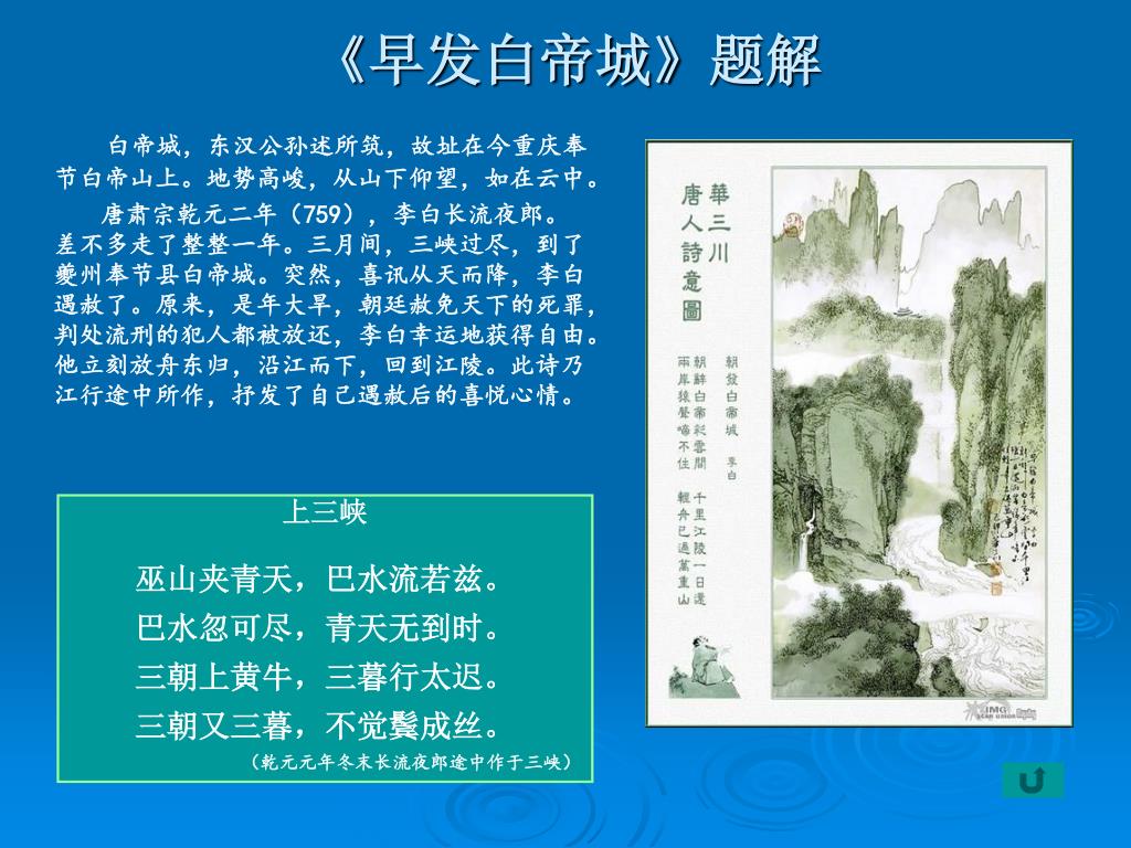《早发白帝城》题解 白帝城,东汉公孙述所筑,故址在今重庆奉节白帝山上。地势高峻,从山下仰望,如在云中。 唐肃宗乾元二年(759),李白长流夜郎。差不多走了整整一年。三月间,三峡过尽,到了夔州奉节县白帝城。突然,喜讯从天而降,李白遇赦了。原来,是年大旱,朝廷赦免天下的死罪,判处流刑的犯人都被放还,李白幸运地获得自由。他立刻放舟东归,沿江而下,回到江陵。此诗乃江行途中所作,抒发了自己遇赦后的喜悦心情。 上三峡 巫山夹青天,巴水流若兹。 巴水忽可尽,青天无到时。 三朝上黄牛,三暮行太迟。 三朝又三暮,不觉鬓成丝。 (乾元元年冬末长流夜郎途中作于三峡)