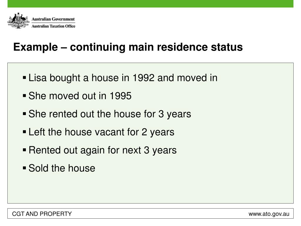 Example – continuing main residence status • Lisa bought a house in 1992 and moved in • She moved out in 1995 • She rented out the house for 3 years • Left the house vacant for 2 years • Rented out again for next 3 years • Sold the house
