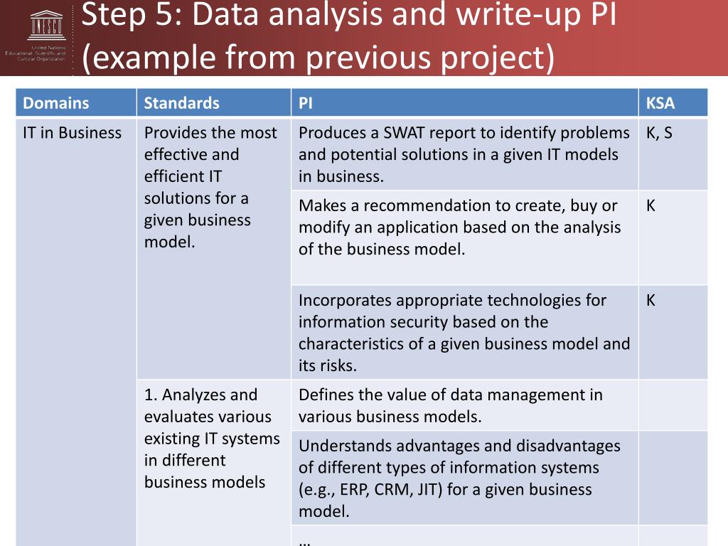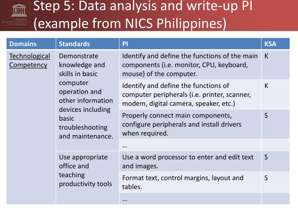 Step 5: Data analysis and write-up PI (worksheet D) • For your selected standards, draft competency/performance indicators. • A performance indicator should be an element of knowledge, skills and attitude and measurable and assessable.