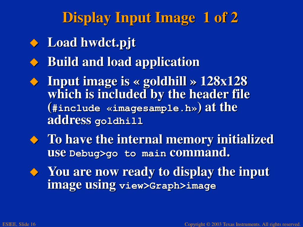 Display Input Image 1 of 2 • Load hwdct.pjt • Build and load application • Input image is « goldhill » 128x128 which is included by the header file (#include «imagesample.h») at the address goldhill • To have the internal memory initialized use Debug>go to main command. • You are now ready to display the input image using view>Graph>image