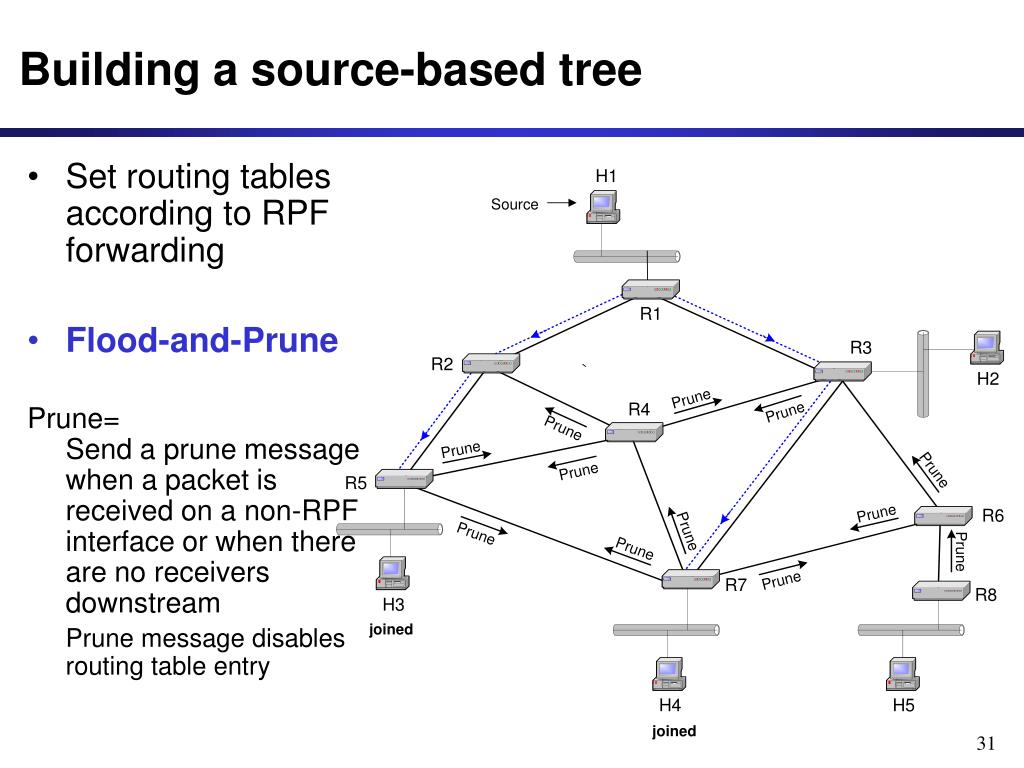 Building a source-based tree • Set routing tables according to RPF forwarding • Flood-and-Prune Flood= Forward packets on all non-RPF interfaces Receiver drops packets not received on RPF interface