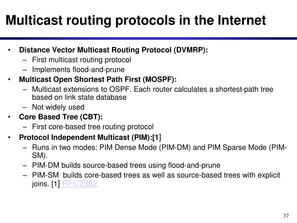 Multicast routing protocols in the Internet • Distance Vector Multicast Routing Protocol (DVMRP): • First multicast routing protocol • Implements flood-and-prune • Multicast Open Shortest Path First (MOSPF): • Multicast extensions to OSPF. Each router calculates a shortest-path tree based on link state database • Not widely used • Core Based Tree (CBT): • First core-based tree routing protocol • Protocol Independent Multicast (PIM):[1] • Runs in two modes: PIM Dense Mode (PIM-DM) and PIM Sparse Mode (PIM-SM). • PIM-DM builds source-based trees using flood-and-prune • PIM-SM builds core-based trees as well as source-based trees with explicit joins. [1] RFC2362