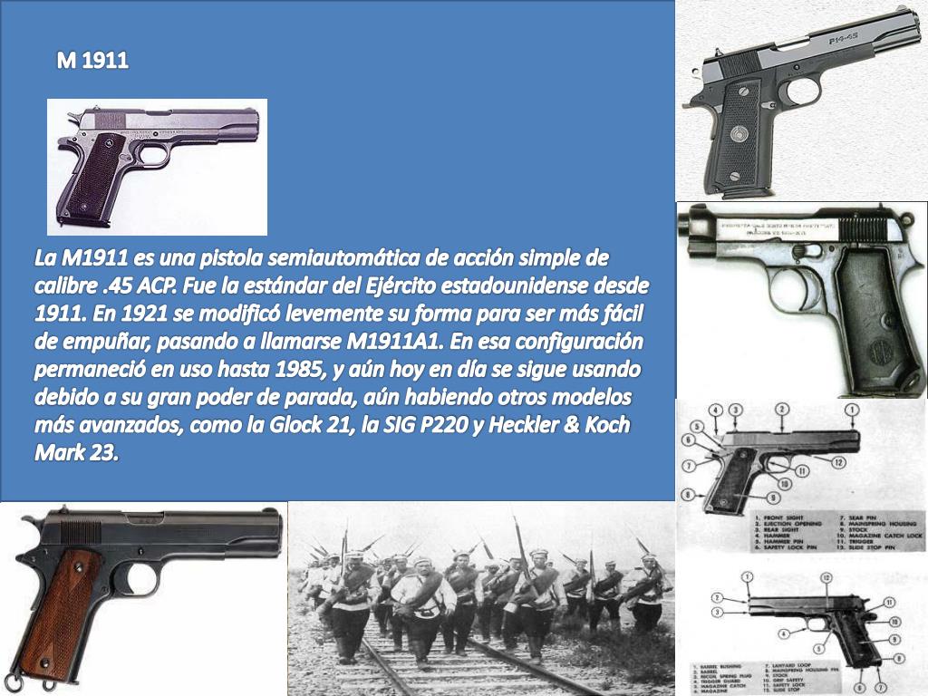 M 1911 La M1911 es una pistola semiautomática de acción simple de calibre .45 ACP. Fue la estándar del Ejército estadounidense desde 1911. En 1921 se modificó levemente su forma para ser más fácil de empuñar, pasando a llamarse M1911A1. En esa configuración permaneció en uso hasta 1985, y aún hoy en día se sigue usando debido a su gran poder de parada, aún habiendo otros modelos más avanzados, como la Glock 21, la SIG P220 y Heckler & Koch Mark 23.