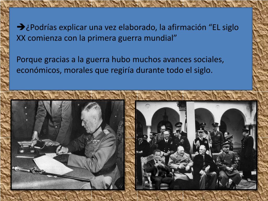 ¿Podrías explicar una vez elaborado, la afirmación “EL siglo XX comienza con la primera guerra mundial” • Porque gracias a la guerra hubo muchos avances sociales, económicos, morales que regiría durante todo el siglo.