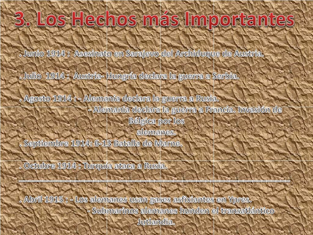 3. Los Hechos más Importantes . Junio 1914 : Asesinato en Sarajevo del Archiduque de Austria. . Julio 1914 : Austria- Hungría declara la guerra a Serbia. . Agosto 1914 : - Alemania declara la guerra a Rusia. - Alemania declara la guerra a Francia. Invasión de Bélgica por los alemanes. . Septiembre 1914: 6-13 Batalla de Marne. . Octubre 1914 : Turquía ataca a Rusia. __________________________________________________________ . Abril 1915 : - Los alemanes usan gases asfixiantes en Ypres. - Submarinos alemanes hunden el transatlántico Jutlandia.