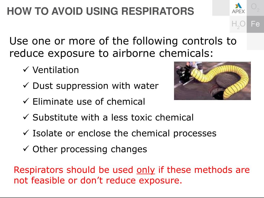 HOW TO AVOID USING RESPIRATORS • Use one or more of the following controls to reduce exposure to airborne chemicals: • Ventilation • Dust suppression with water • Eliminate use of chemical • Substitute with a less toxic chemical • Isolate or enclose the chemical processes • Other processing changes Respirators should be used only if these methods are not feasible or don’t reduce exposure.