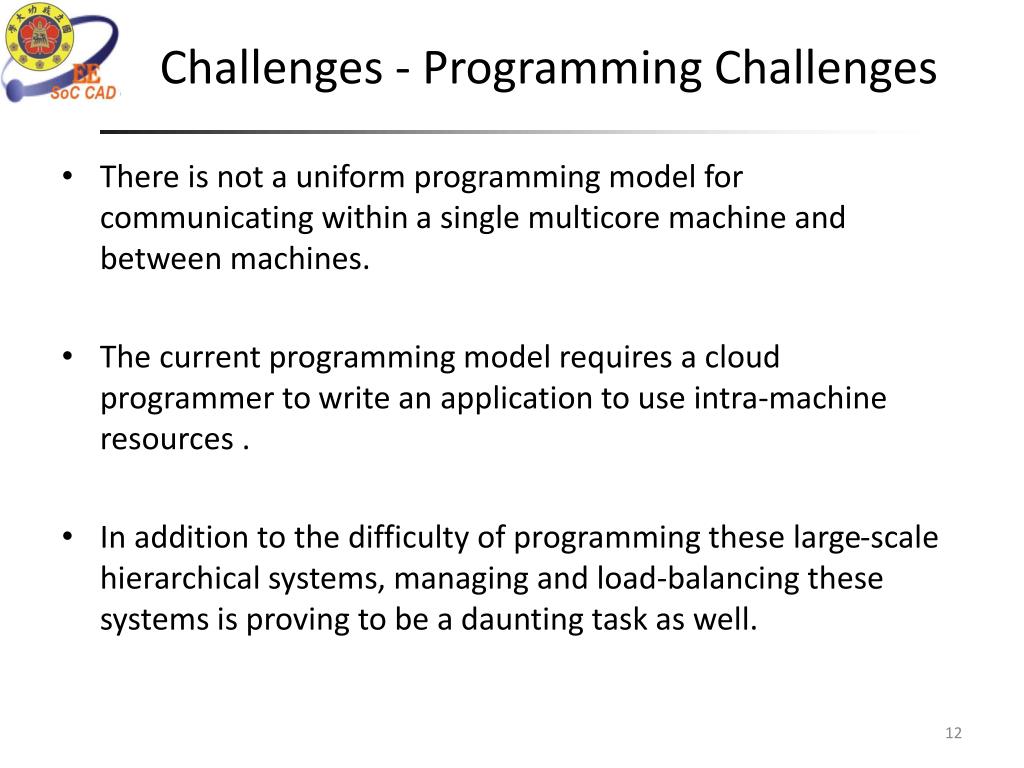 Challenges - Programming Challenges • There is not a uniform programming model for communicating within a single multicore machine and between machines. • The current programming model requires a cloud programmer to write an application to use intra-machine resources . • In addition to the difficulty of programming these large-scale hierarchical systems, managing and load-balancing these systems is proving to be a daunting task as well.
