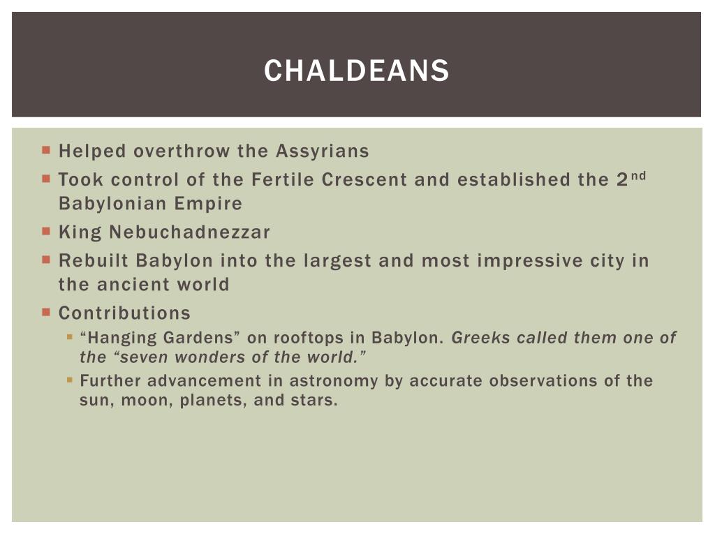 Chaldeans • Helped overthrow the Assyrians • Took control of the Fertile Crescent and established the 2nd Babylonian Empire • King Nebuchadnezzar • Rebuilt Babylon into the largest and most impressive city in the ancient world • Contributions • “Hanging Gardens” on rooftops in Babylon. Greeks called them one of the “seven wonders of the world.” • Further advancement in astronomy by accurate observations of the sun, moon, planets, and stars.