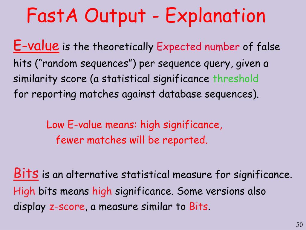 FastA Output - Explanation E-value is the theoreticallyExpected number of false hits (“random sequences”) per sequence query, given a similarity score (a statistical significancethreshold for reporting matches against database sequences). Low E-value means: high significance, fewer matches will be reported. Bitsis an alternative statistical measure for significance. Highbits meanshighsignificance. Some versions also displayz-score, a measure similar toBits.