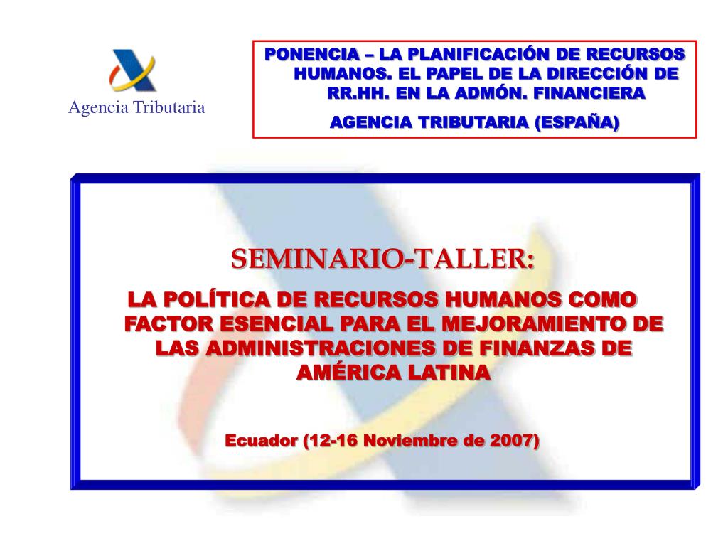 PONENCIA – LA PLANIFICACIÓN DE RECURSOS HUMANOS. EL PAPEL DE LA DIRECCIÓN DE RR.HH. EN LA ADMÓN. FINANCIERA AGENCIA TRIBUTARIA (ESPAÑA) SEMINARIO-TALLER: LA POLÍTICA DE RECURSOS HUMANOS COMO FACTOR ESENCIAL PARA EL MEJORAMIENTO DE LAS ADMINISTRACIONES DE FINANZAS DE AMÉRICA LATINA Ecuador (12-16 Noviembre de 2007)