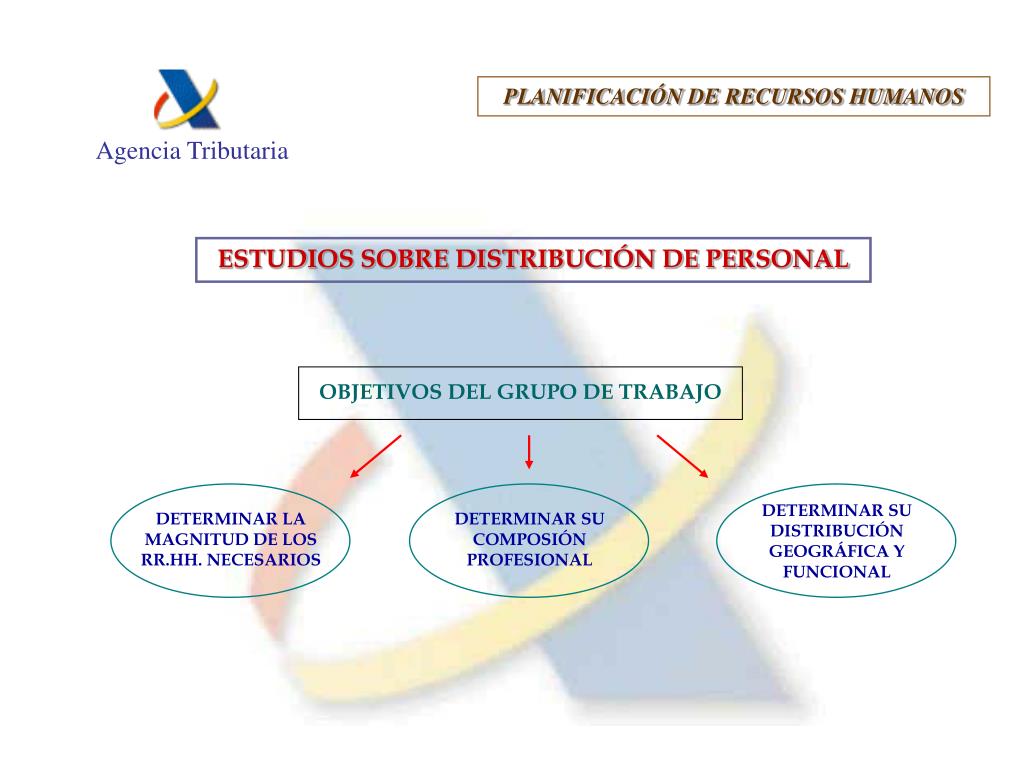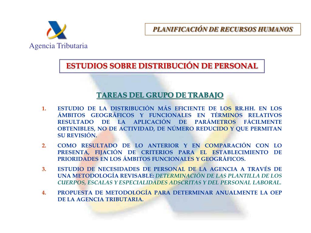 PLANIFICACIÓN DE RECURSOS HUMANOS ESTUDIOS SOBRE DISTRIBUCIÓN DE PERSONAL TAREAS DEL GRUPO DE TRABAJO • ESTUDIO DE LA DISTRIBUCIÓN MÁS EFICIENTE DE LOS RR.HH. EN LOS ÁMBITOS GEOGRÁFICOS Y FUNCIONALES EN TÉRMINOS RELATIVOS RESULTADO DE LA APLICACIÓN DE PARÁMETROS FÁCILMENTE OBTENIBLES, NO DE ACTIVIDAD, DE NÚMERO REDUCIDO Y QUE PERMITAN SU REVISIÓN. • COMO RESULTADO DE LO ANTERIOR Y EN COMPARACIÓN CON LO PRESENTA, FIJACIÓN DE CRITERIOS PARA EL ESTABLECIMIENTO DE PRIORIDADES EN LOS ÁMBITOS FUNCIONALES Y GEOGRÁFICOS. • ESTUDIO DE NECESIDADES DE PERSONAL DE LA AGENCIA A TRAVÉS DE UNA METODOLOGÍA REVISABLE: DETERMINACIÓN DE LAS PLANTILLA DE LOS CUERPOS, ESCALAS Y ESPECIALIDADES ADSCRITAS Y DEL PERSONAL LABORAL. • PROPUESTA DE METODOLOGÍA PARA DETERMINAR ANUALMENTE LA OEP DE LA AGENCIA TRIBUTARIA.