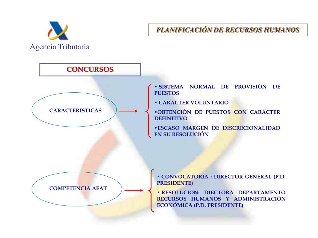 PLANIFICACIÓN DE RECURSOS HUMANOS CONCURSOS • SISTEMA NORMAL DE PROVISIÓN DE PUESTOS • CARÁCTER VOLUNTARIO • OBTENCIÓN DE PUESTOS CON CARÁCTER DEFINITIVO • ESCASO MARGEN DE DISCRECIONALIDAD EN SU RESOLUCIÓN CARACTERÍSTICAS • CONVOCATORIA : DIRECTOR GENERAL (P.D. PRESIDENTE) • RESOLUCIÓN: DIECTORA DEPARTAMENTO RECURSOS HUMANOS Y ADMINISTRACIÓN ECONÓMICA (P.D. PRESIDENTE) COMPETENCIA AEAT