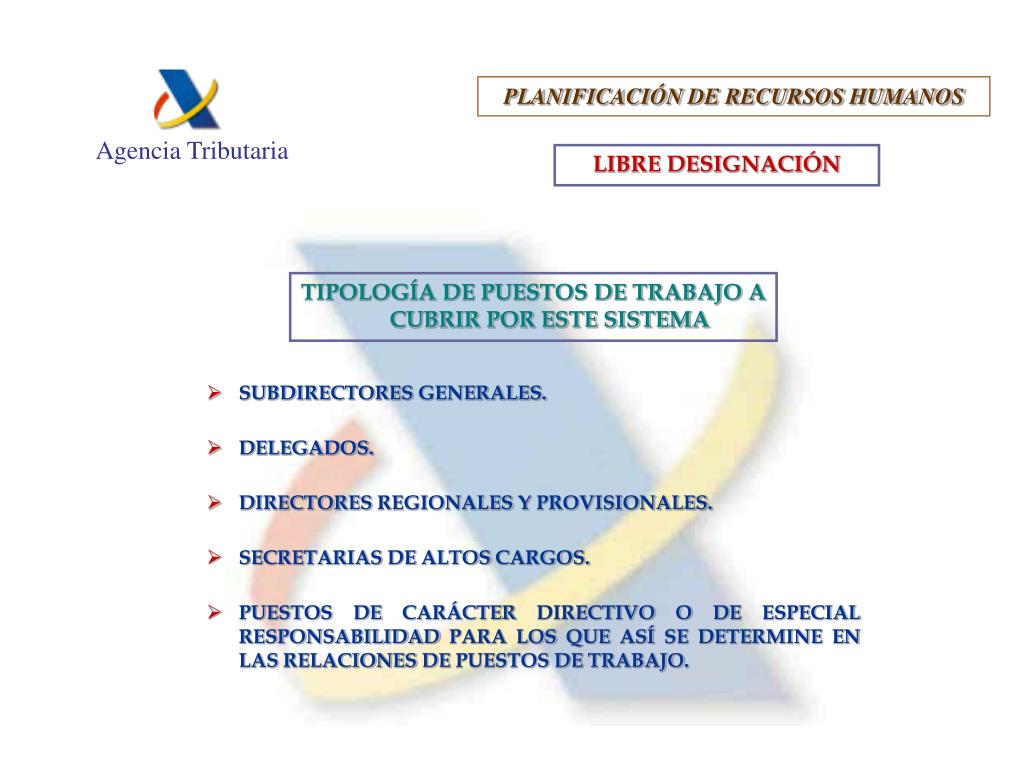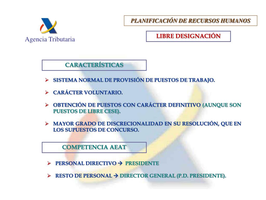 PLANIFICACIÓN DE RECURSOS HUMANOS LIBRE DESIGNACIÓN CARACTERÍSTICAS • SISTEMA NORMAL DE PROVISIÓN DE PUESTOS DE TRABAJO. • CARÁCTER VOLUNTARIO. • OBTENCIÓN DE PUESTOS CON CARÁCTER DEFINITIVO (AUNQUE SON PUESTOS DE LIBRE CESE). • MAYOR GRADO DE DISCRECIONALIDAD EN SU RESOLUCIÓN, QUE EN LOS SUPUESTOS DE CONCURSO. COMPETENCIA AEAT • PERSONAL DIRECTIVO PRESIDENTE • RESTO DE PERSONAL DIRECTOR GENERAL (P.D. PRESIDENTE).