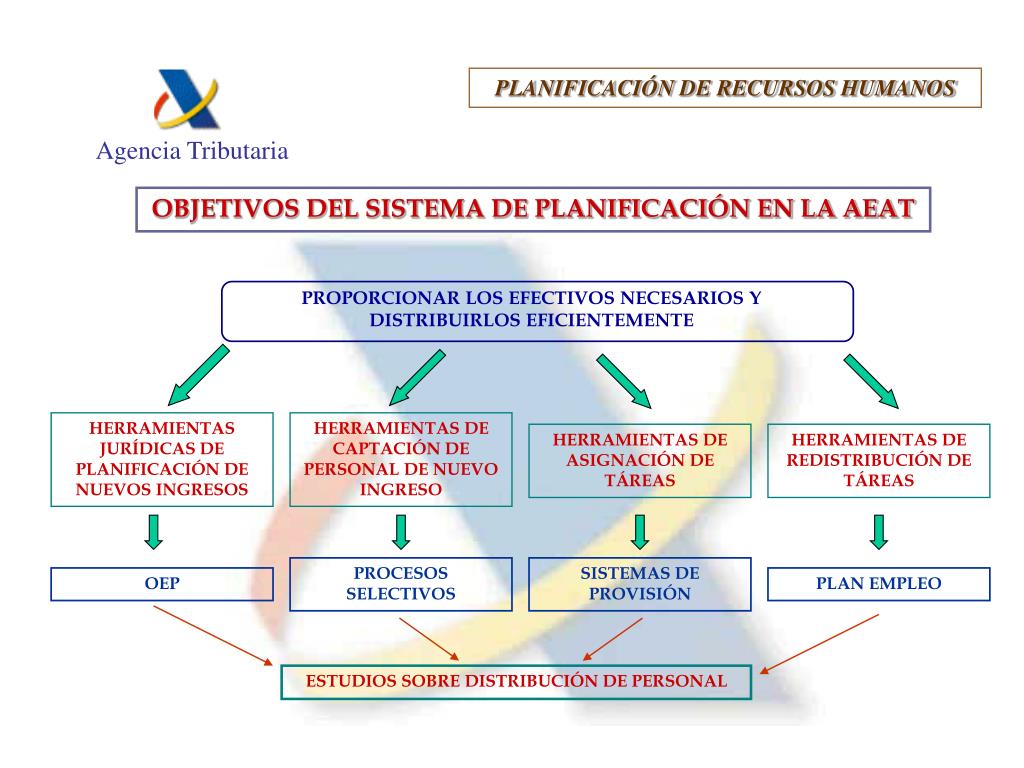 PLANIFICACIÓN DE RECURSOS HUMANOS OBJETIVOS DEL SISTEMA DE PLANIFICACIÓN EN LA AEAT PROPORCIONAR LOS EFECTIVOS NECESARIOS Y DISTRIBUIRLOS EFICIENTEMENTE HERRAMIENTAS JURÍDICAS DE PLANIFICACIÓN DE NUEVOS INGRESOS HERRAMIENTAS DE CAPTACIÓN DE PERSONAL DE NUEVO INGRESO HERRAMIENTAS DE ASIGNACIÓN DE TÁREAS HERRAMIENTAS DE REDISTRIBUCIÓN DE TÁREAS PROCESOS SELECTIVOS SISTEMAS DE PROVISIÓN OEP PLAN EMPLEO ESTUDIOS SOBRE DISTRIBUCIÓN DE PERSONAL