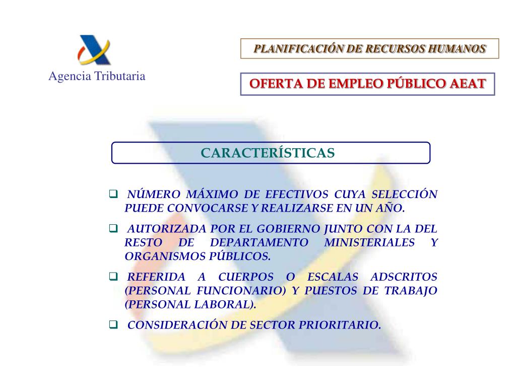 PLANIFICACIÓN DE RECURSOS HUMANOS OFERTA DE EMPLEO PÚBLICO AEAT CARACTERÍSTICAS • NÚMERO MÁXIMO DE EFECTIVOS CUYA SELECCIÓN PUEDE CONVOCARSE Y REALIZARSE EN UN AÑO. • AUTORIZADA POR EL GOBIERNO JUNTO CON LA DEL RESTO DE DEPARTAMENTO MINISTERIALES Y ORGANISMOS PÚBLICOS. • REFERIDA A CUERPOS O ESCALAS ADSCRITOS (PERSONAL FUNCIONARIO) Y PUESTOS DE TRABAJO (PERSONAL LABORAL). • CONSIDERACIÓN DE SECTOR PRIORITARIO.