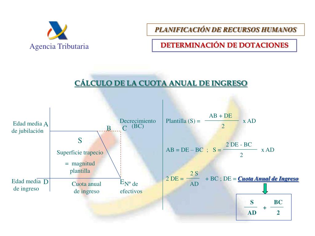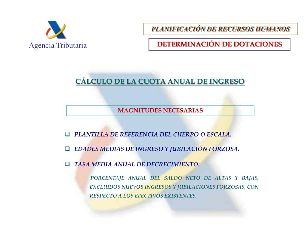 PLANIFICACIÓN DE RECURSOS HUMANOS DETERMINACIÓN DE DOTACIONES CÁLCULO DE LA CUOTA ANUAL DE INGRESO MAGNITUDES NECESARIAS • PLANTILLA DE REFERENCIA DEL CUERPO O ESCALA. • EDADES MEDIAS DE INGRESO Y JUBILACIÓN FORZOSA. • TASA MEDIA ANUAL DE DECRECIMIENTO: PORCENTAJE ANUAL DEL SALDO NETO DE ALTAS Y BAJAS, EXCLUIDOS NUEVOS INGRESOS Y JUBILACIONES FORZOSAS, CON RESPECTO A LOS EFECTIVOS EXISTENTES.