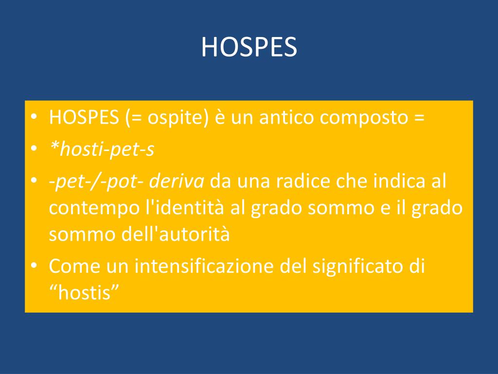 HOSPES • HOSPES (= ospite) è un antico composto = • *hosti-pet-s • -pet-/-pot- deriva da una radice che indica al contempo l'identità al grado sommo e il grado sommo dell'autorità • Come un intensificazione del significato di “hostis”