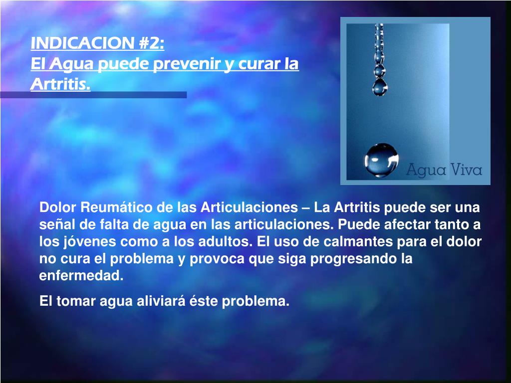 INDICACION #2: El Agua puede prevenir y curar la Artritis. Dolor Reumático de las Articulaciones – La Artritis puede ser una señal de falta de agua en las articulaciones. Puede afectar tanto a los jóvenes como a los adultos. El uso de calmantes para el dolor no cura el problema y provoca que siga progresando la enfermedad. El tomar agua aliviará éste problema.