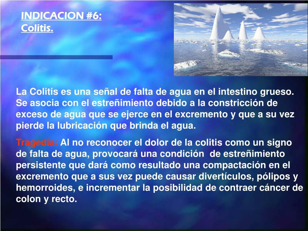 INDICACION #6: Colitis. La Colitis es una señal de falta de agua en el intestino grueso. Se asocia con el estreñimiento debido a la constricción de exceso de agua que se ejerce en el excremento y que a su vez pierde la lubricación que brinda el agua. Tragedia: Al no reconocer el dolor de la colitis como un signo de falta de agua, provocará una condición de estreñimiento persistente que dará como resultado una compactación en el excremento que a sus vez puede causar divertículos, pólipos y hemorroides, e incrementar la posibilidad de contraer cáncer de colon y recto.