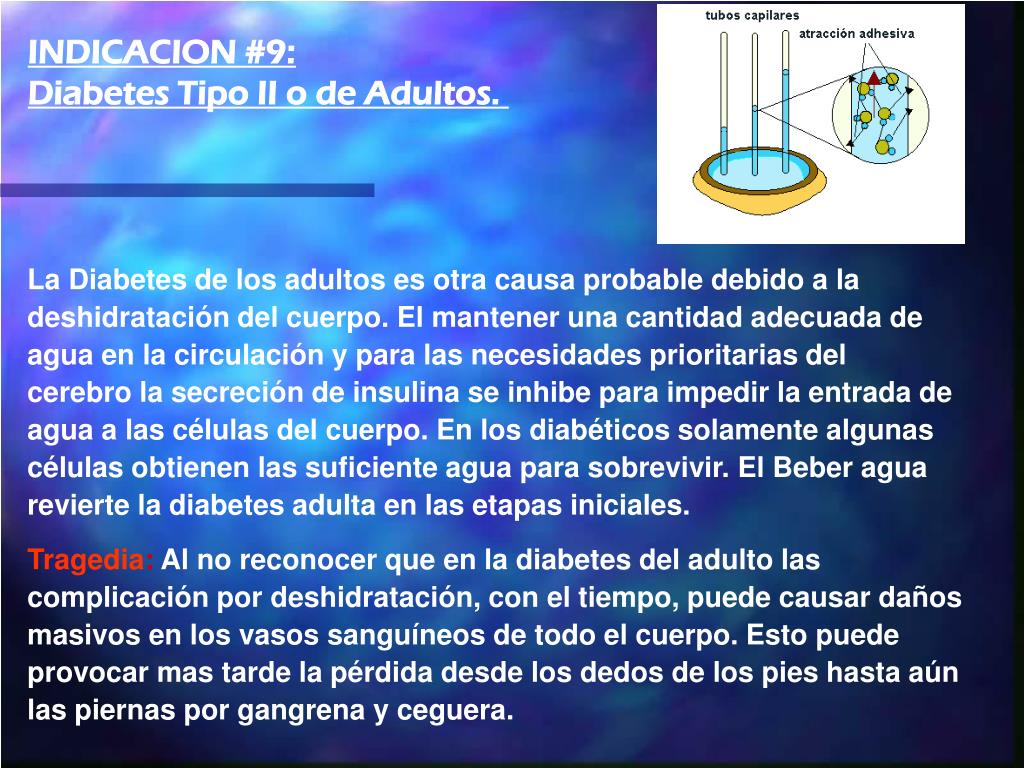 INDICACION #9: Diabetes Tipo II o de Adultos. La Diabetes de los adultos es otra causa probable debido a la deshidratación del cuerpo. El mantener una cantidad adecuada de agua en la circulación y para las necesidades prioritarias del cerebro la secreción de insulina se inhibe para impedir la entrada de agua a las células del cuerpo. En los diabéticos solamente algunas células obtienen las suficiente agua para sobrevivir. El Beber agua revierte la diabetes adulta en las etapas iniciales. Tragedia: Al no reconocer que en la diabetes del adulto las complicación por deshidratación, con el tiempo, puede causar daños masivos en los vasos sanguíneos de todo el cuerpo. Esto puede provocar mas tarde la pérdida desde los dedos de los pies hasta aún las piernas por gangrena y ceguera.