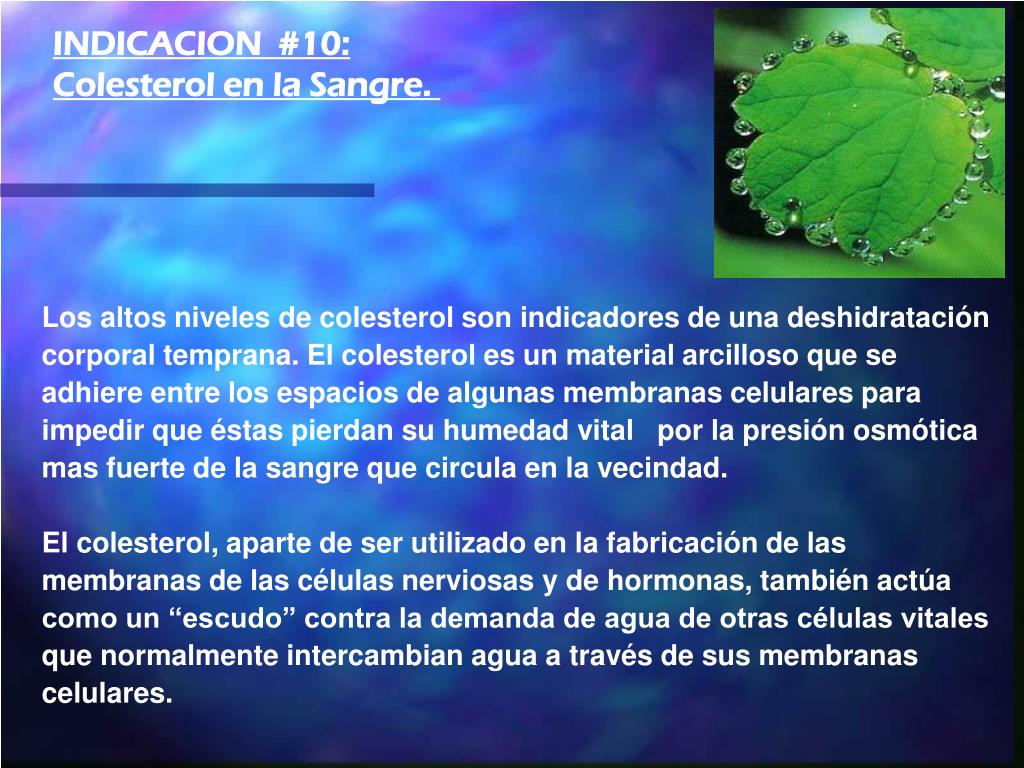 INDICACION #10: Colesterol en la Sangre. Los altos niveles de colesterol son indicadores de una deshidratación corporal temprana. El colesterol es un material arcilloso que se adhiere entre los espacios de algunas membranas celulares para impedir que éstas pierdan su humedad vital por la presión osmótica mas fuerte de la sangre que circula en la vecindad. El colesterol, aparte de ser utilizado en la fabricación de las membranas de las células nerviosas y de hormonas, también actúa como un “escudo” contra la demanda de agua de otras células vitales que normalmente intercambian agua a través de sus membranas celulares.