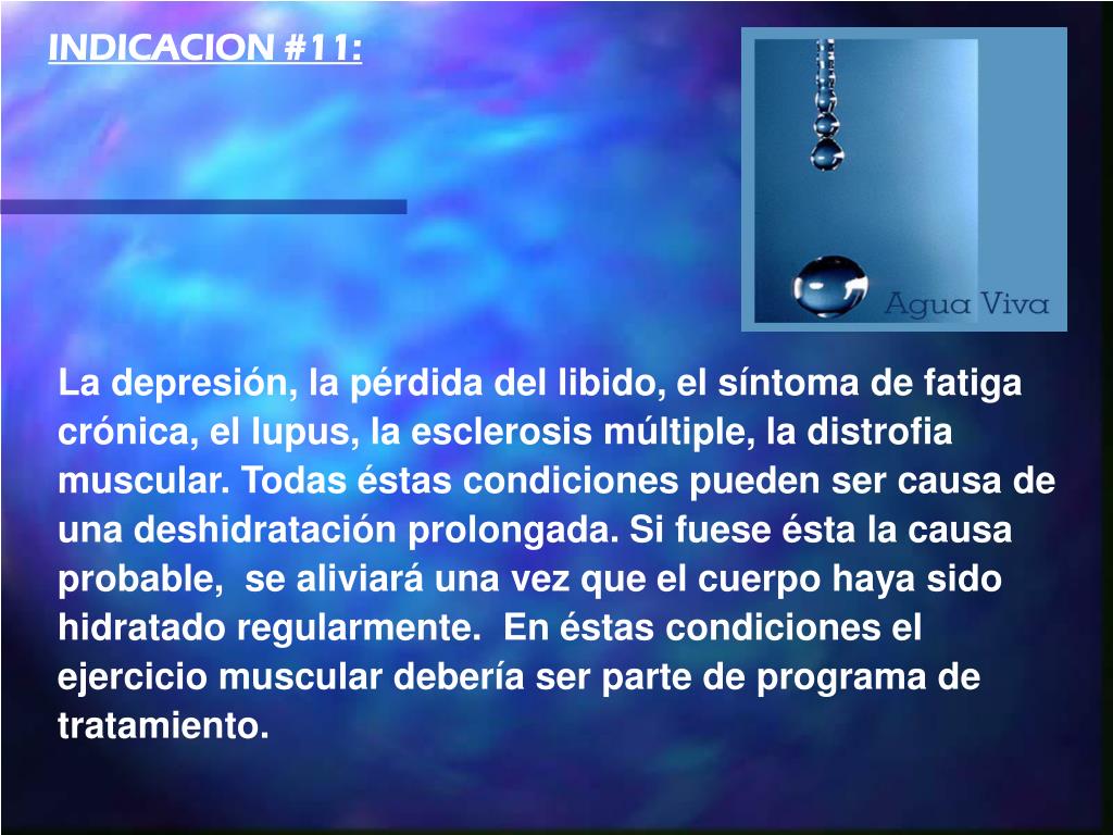 INDICACION #11: La depresión, la pérdida del libido, el síntoma de fatiga crónica, el lupus, la esclerosis múltiple, la distrofia muscular. Todas éstas condiciones pueden ser causa de una deshidratación prolongada. Si fuese ésta la causa probable, se aliviará una vez que el cuerpo haya sido hidratado regularmente. En éstas condiciones el ejercicio muscular debería ser parte de programa de tratamiento.