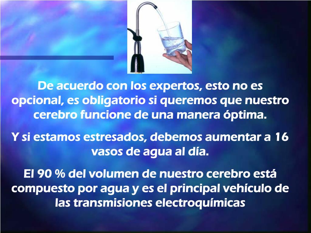 De acuerdo con los expertos, esto no es opcional, es obligatorio si queremos que nuestro cerebro funcione de una manera óptima. Y si estamos estresados, debemos aumentar a 16 vasos de agua al día. El 90 % del volumen de nuestro cerebro está compuesto por agua y es el principal vehículo de las transmisiones electroquímicas