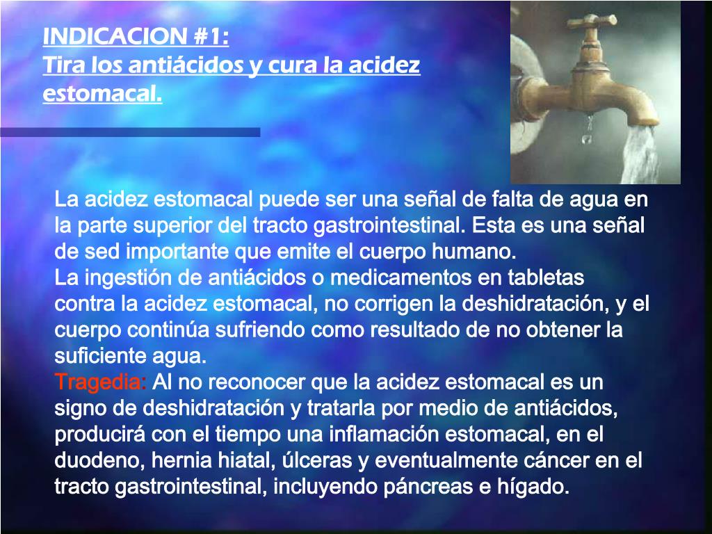 INDICACION #1: Tira los antiácidos y cura la acidez estomacal. La acidez estomacal puede ser una señal de falta de agua en la parte superior del tracto gastrointestinal. Esta es una señal de sed importante que emite el cuerpo humano. La ingestión de antiácidos o medicamentos en tabletas contra la acidez estomacal, no corrigen la deshidratación, y el cuerpo continúa sufriendo como resultado de no obtener la suficiente agua. Tragedia: Al no reconocer que la acidez estomacal es un signo de deshidratación y tratarla por medio de antiácidos, producirá con el tiempo una inflamación estomacal, en el duodeno, hernia hiatal, úlceras y eventualmente cáncer en el tracto gastrointestinal, incluyendo páncreas e hígado.
