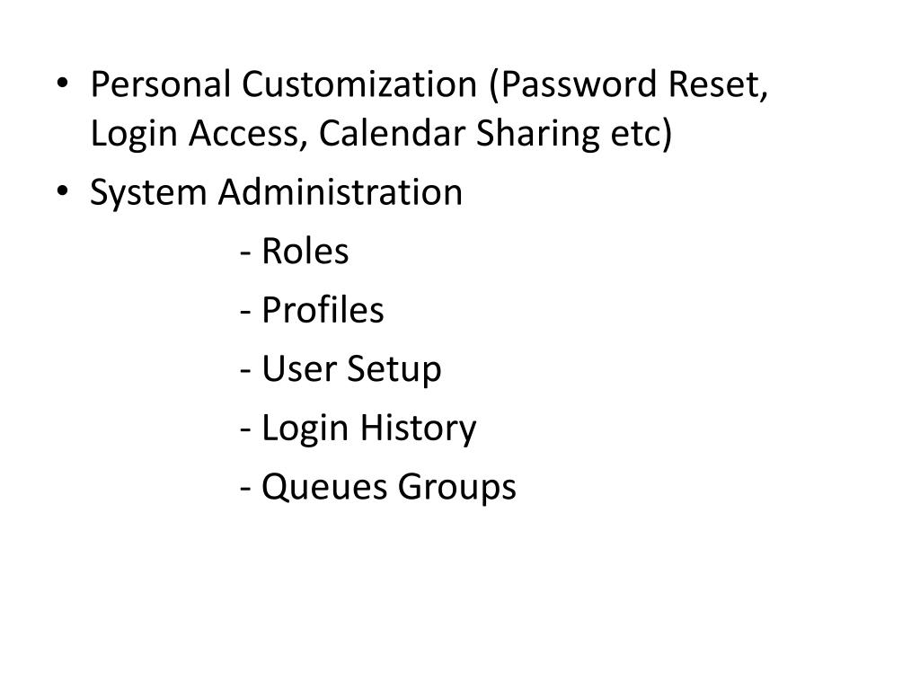 Personal Customization (Password Reset, Login Access, Calendar Sharing etc) • System Administration - Roles - Profiles - User Setup - Login History - Queues Groups